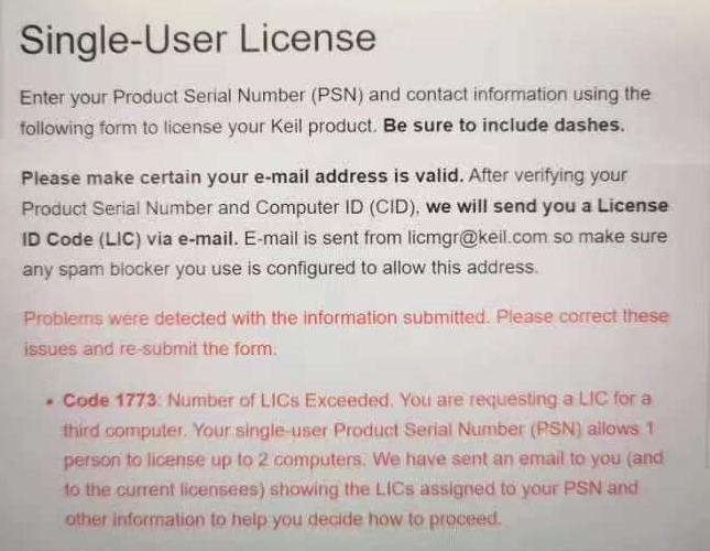 在安装LIC时,在Keil单用户许可证页面上单击Submit后出现错误:Code 1773 Number of LICs for this PSN Exceeded。