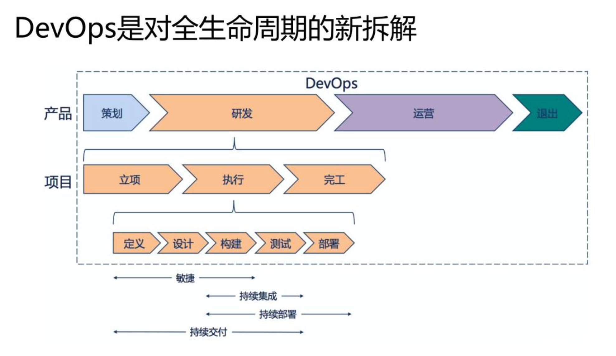 DevOps生命周期主要包括产品(策划、研发、运营、推出)、项目(立项、执行、完工),而敏捷、持续集成、持续部署、持续交付都是 DevOps 的一个局部的阶段。