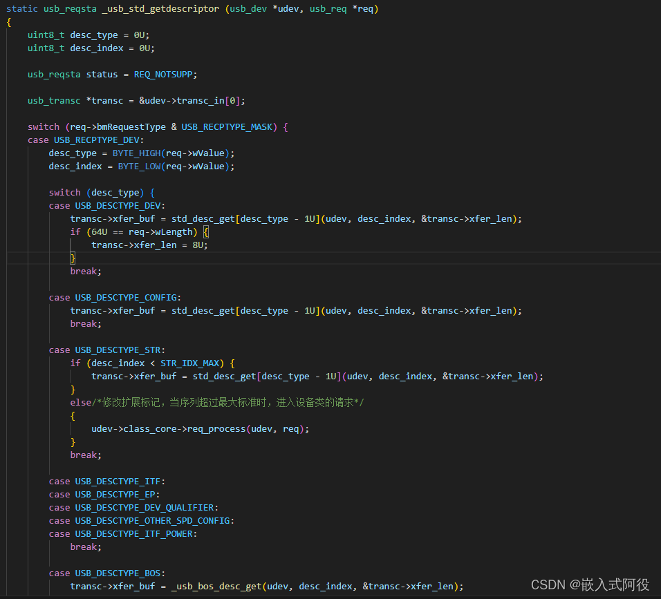 1.当设备受到主机获取描述符的标准请求后会进入这里,这里可以发现会根据请求数据判定为获取设备描述符、获取配置描述符、获取字符串描述符三个大类进入 std_desc_get[ ]这个函数指针数组的函数。