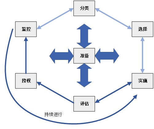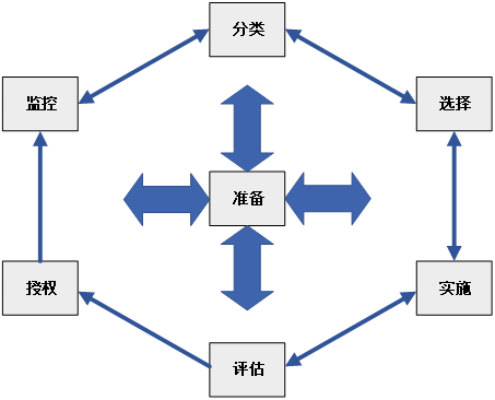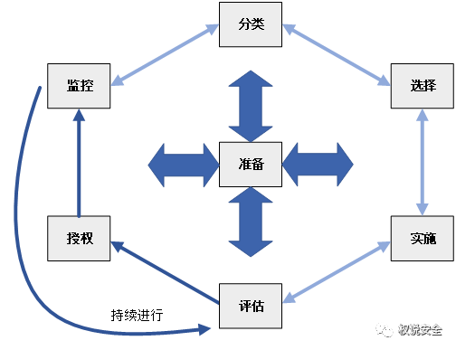 NIST《信息系统和企业风险管理框架:安全与隐私的系统生命周期》(SP 800-37)描述了风险管理框架方法及其7个环节(或步骤)。