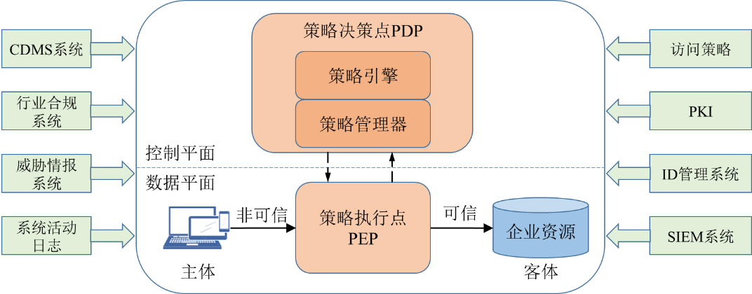 ▶ 策略引擎(Policy Engine,PE)是ZTA实现的“大脑”,对资源访问请求进行评估,依赖来自各数据源的信息输入,如访问日志、威胁情报、设备安全状况和网络ID认证等。