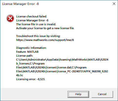 win10系统中启动Matlab 2024b弹出License checkout failed.License Manager Error-8提示的解决办法