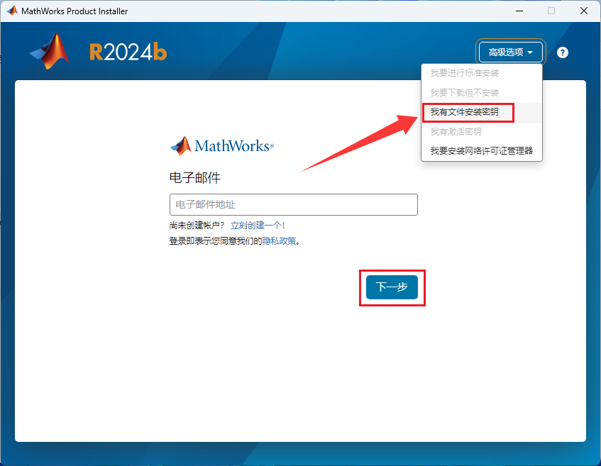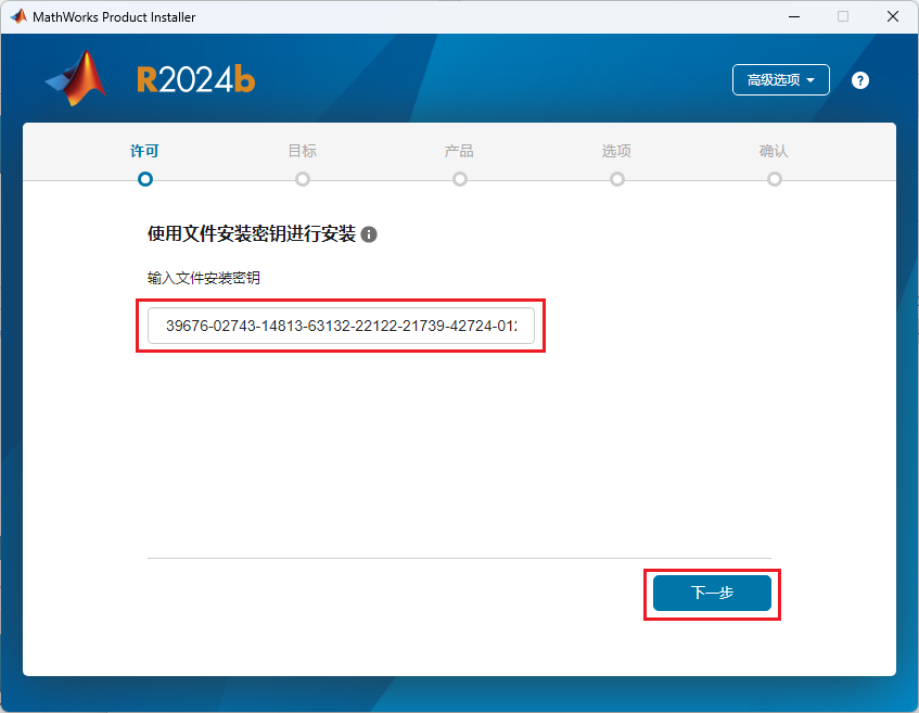 5、点击“高级选项”,“我有文件安装密钥”,点“下一步”