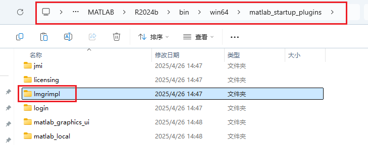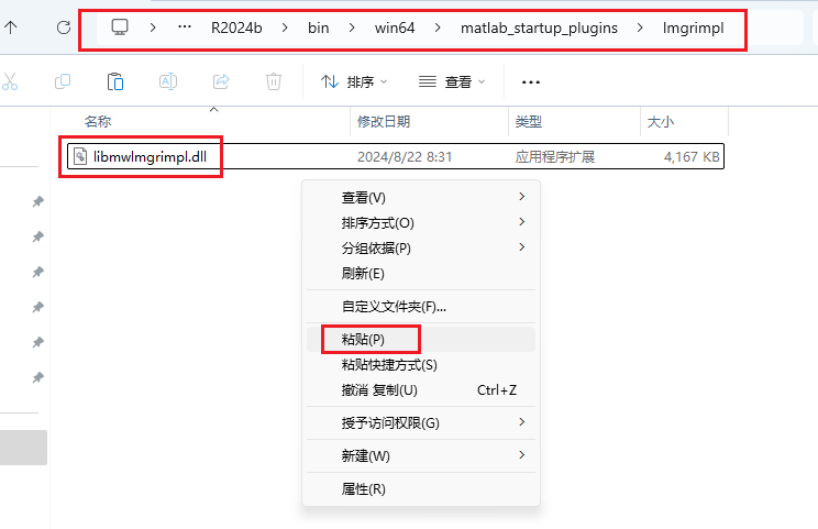 25、在打开的窗口空白处点右键,选“粘贴”,把第20步复制的内容粘贴过来。(完整路径:C:\Program Files\MATLAB\R2024b\bin\win64\matlab_startup_plugins\lmgrimpl)