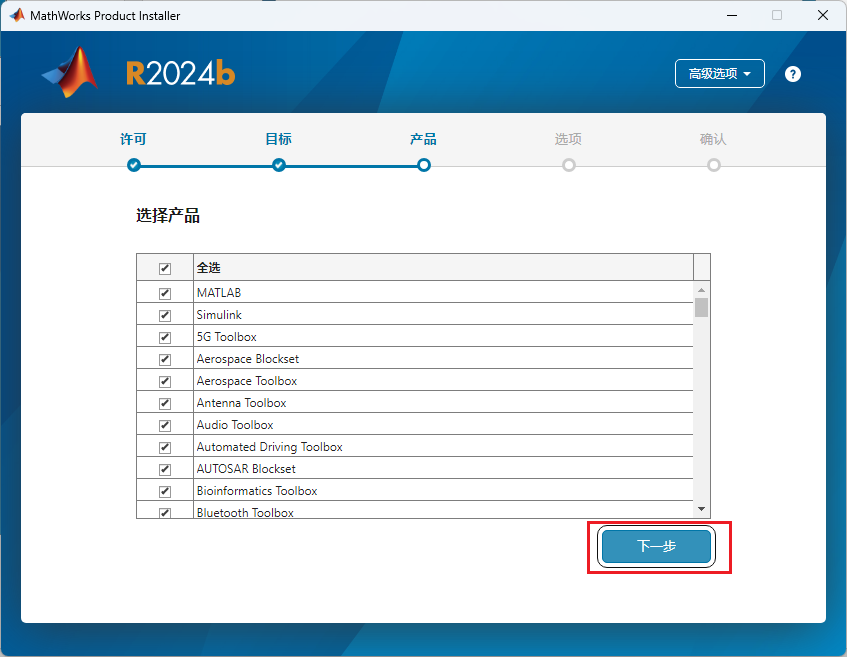 12、选择要安装的产品,默认为全选,点“下一步”。