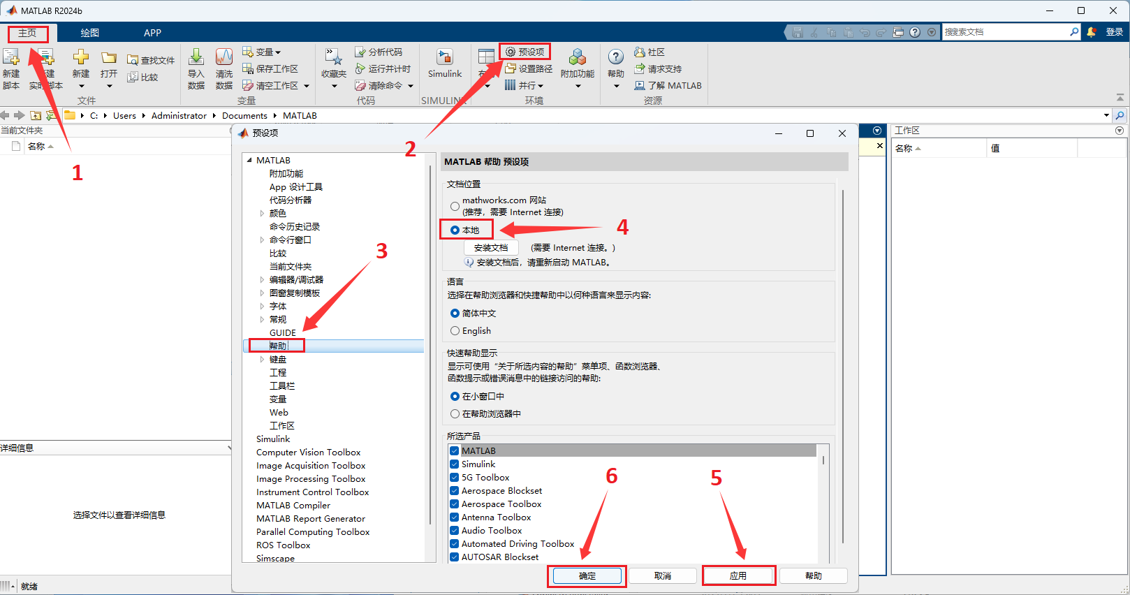 37、双击桌面图标“MATLAB R2024b”运行程序,按下图进行设置,1-“主页”-2-“预设项”-3-“帮助”-4-“本地”-5-“应用”-6-“确定”。完毕后退出程序,然后重启电脑。