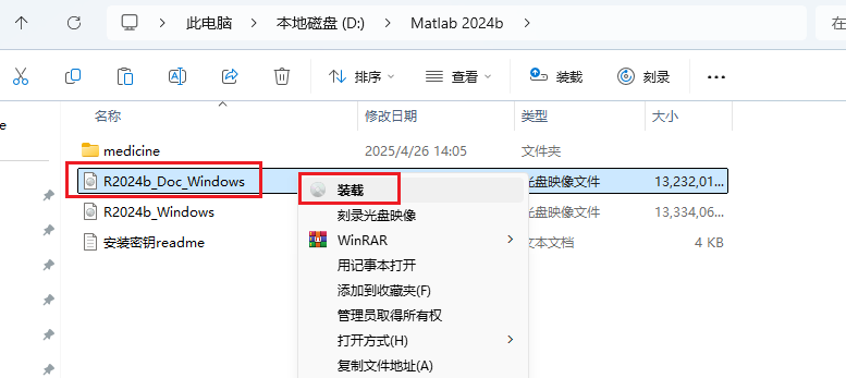 30、选中R2024b_Doc_Windows文件,点鼠标右键,选“装载”(Win10以上系统)