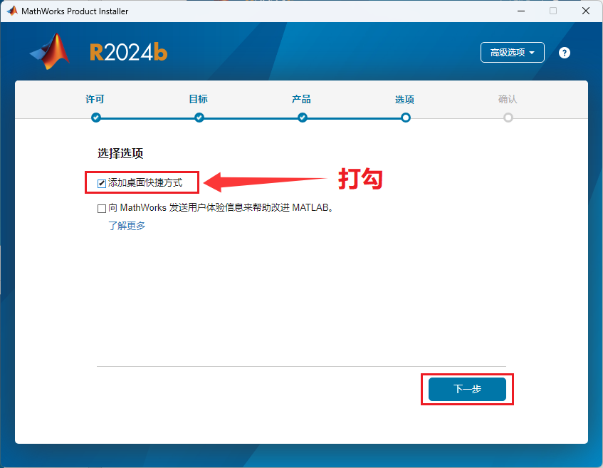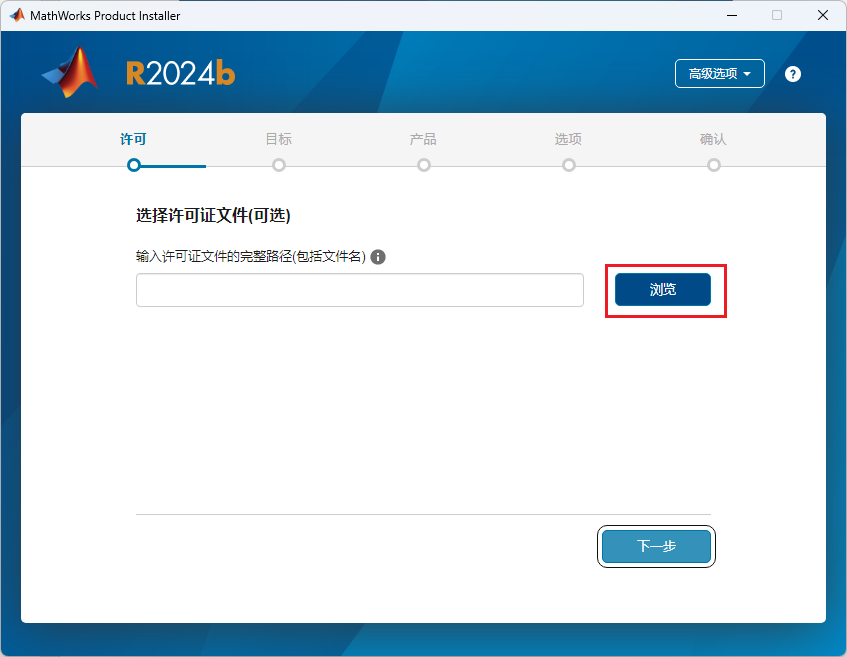 11、选择安装位置,默认安装到C盘 (注:安装路径中不能有中文),本机选择默认安装到C:\Program Files\MATLAB\R2024b,点“下一步”。