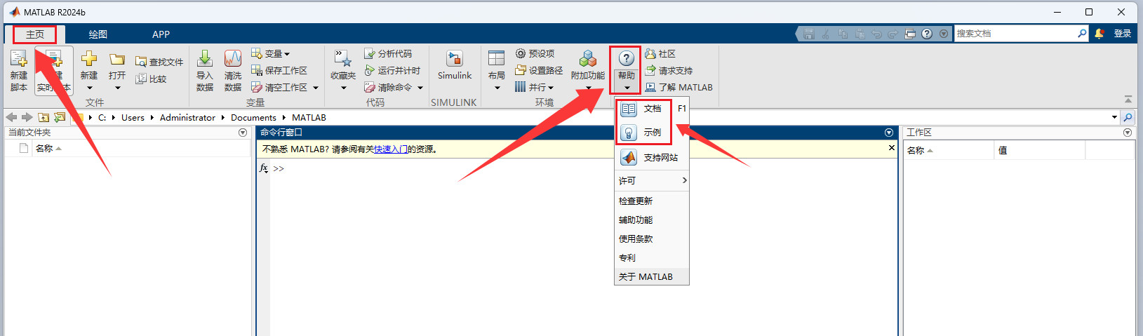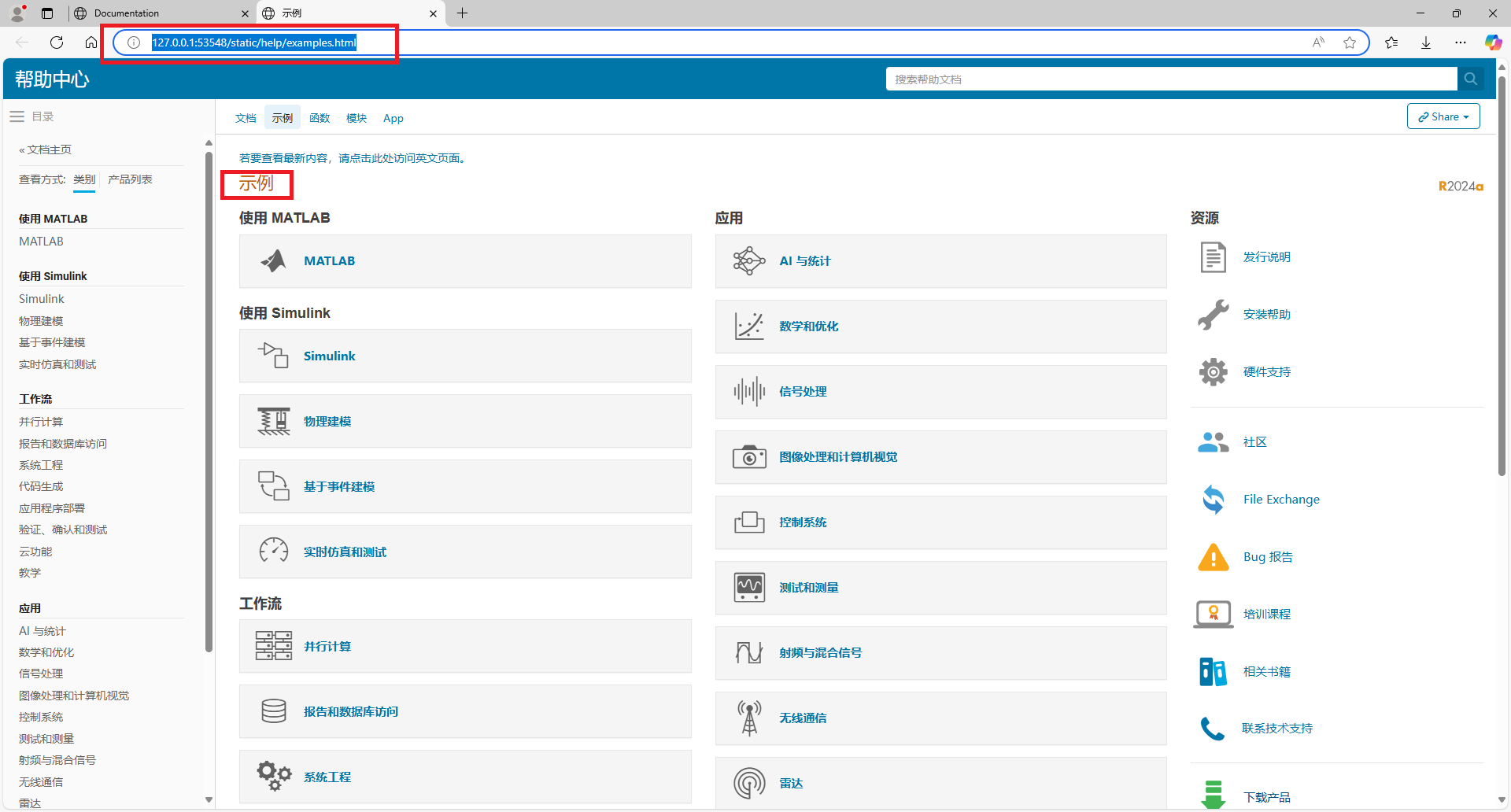 38、重新启动MATLAB R2024b程序后,点“帮助”内的“文档”或“示例”即可看到相关内容了(最好断网测试一下)