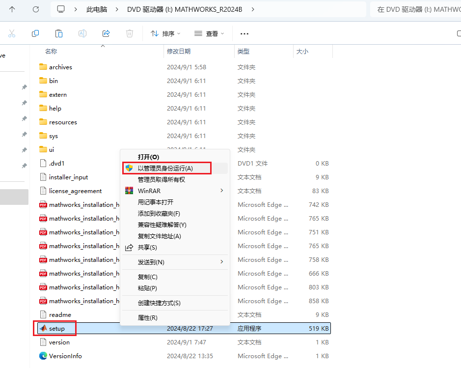 4、选中“Setup”图标,点鼠标右键,选“以管理员身份运行”