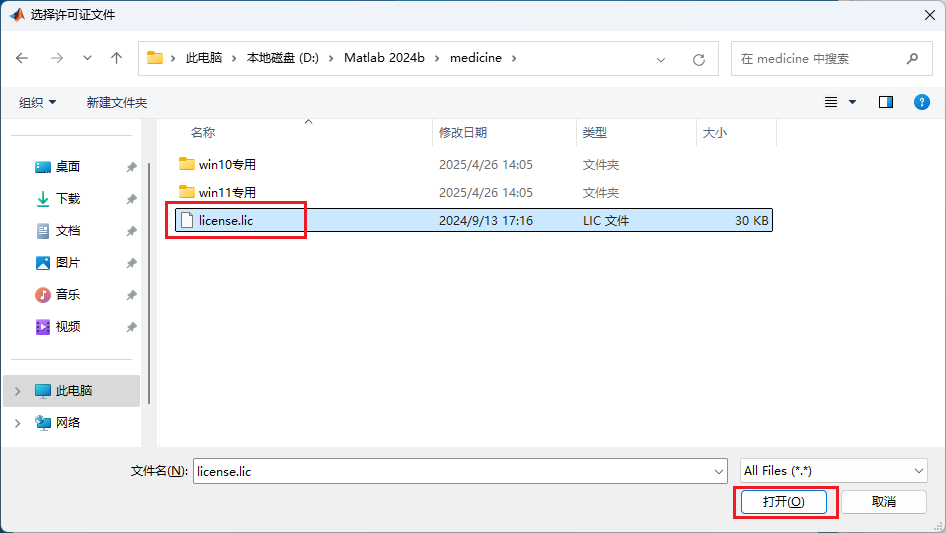 9、进入解压缩后的文件夹Matlab 2024b内,继续进入medicine文件夹内,选择license.lic许可文件,点“打开”。(D:\Matlab 2024b\medicine\license.lic)