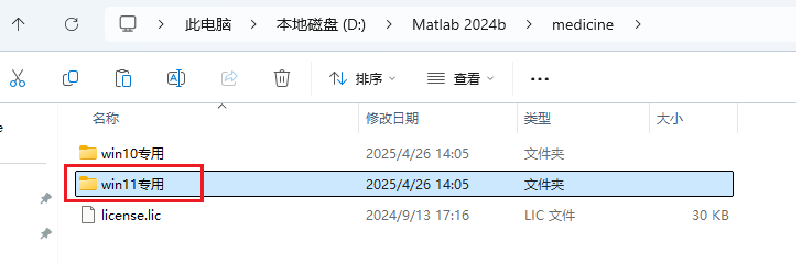 19、继续进入“win11专用”文件夹,因为本机为win11系统。(注意:如果你的系统是Win10,则进入“win10专用”文件夹,此步很重要!!!,否则在win10系统中启动Matlab 2024b会弹出License checkout failed.License Manager Error-8提示,无法运行Matlab 2024b)
