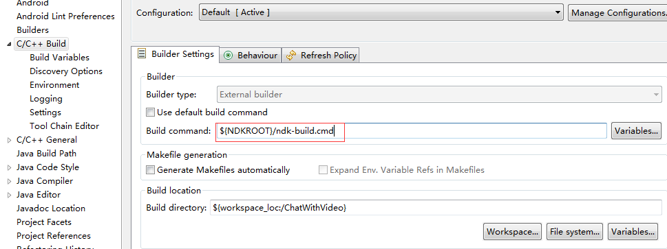 在Build command 添加文本 ${NDKROOT}/ndk-build.cmd 将刚刚配置的NDK路径使用上,点击OK就好了。