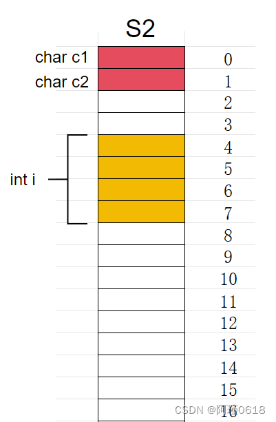 变量c2的大小是1,vs的默认对齐数是8,取较小值,也就是对齐数是1,所以c2要对齐到1的倍数处,因为所有数都是1的倍数,所以在变量 i 后面8的位置保存就行了