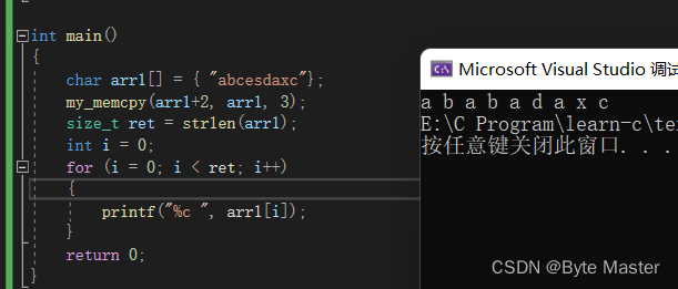 但是再VS上使用库函数memcpy是没有问题的,但是我们依旧再复制有重叠的时候不推荐使用memcpy,我们使用memmove。
