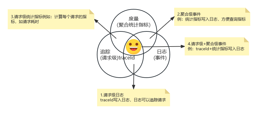 三方交集(图中笑脸):请求级事件(追踪+日志)+聚合级事件(度量+日志)=请求级、聚合级事件 例:traceId+统计指标写入日志。做请求链路级别的,附带有聚合统计指标的日志。这就是可观测性(Observability)的 基础模型。