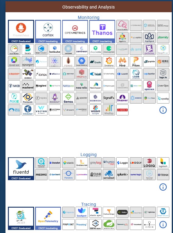 下图是CNCF Interactive Landscape中列出的日志、追踪、度量(度量的核心产品是监控)领域的著名产品,其实这里很多不同领域的产品是跨界的,譬如 ELK 可以通过 Metricbeat 来实现度量的功能,Apache SkyWalking 的探针就有同时支持度量和追踪两方面的数据来源,由OpenTracing进化而来OpenTelemetry更是融合了日志、追踪、度量三者所长,有望成为三者兼备的统一可观测性解决方案。本章后面的讲解,也会扣紧每个领域中最具有统治性产品来进行介绍。