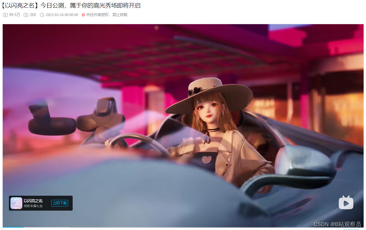在游戏公测当天,官方号在B站发布了一支宣传视频《【以闪亮之名】今日公测,属于你的高光秀场即将开启》,视频吸引99.2万观众前来围观,近百万播放的作品让游戏公测的消息在B站快速传播开。