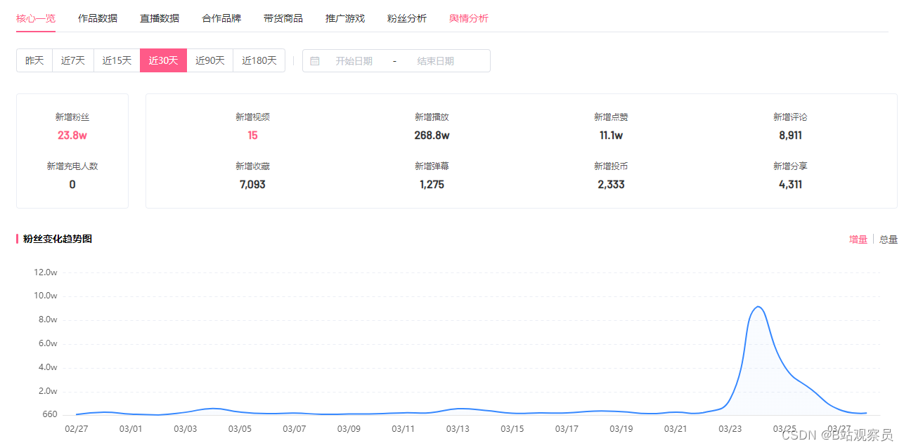 点进官方号主页可以看到,以闪亮之名在近30天内已经涨粉超过20万人,涨粉高峰出现在3月24日,也就是以闪亮之名游戏正式公测当天。
