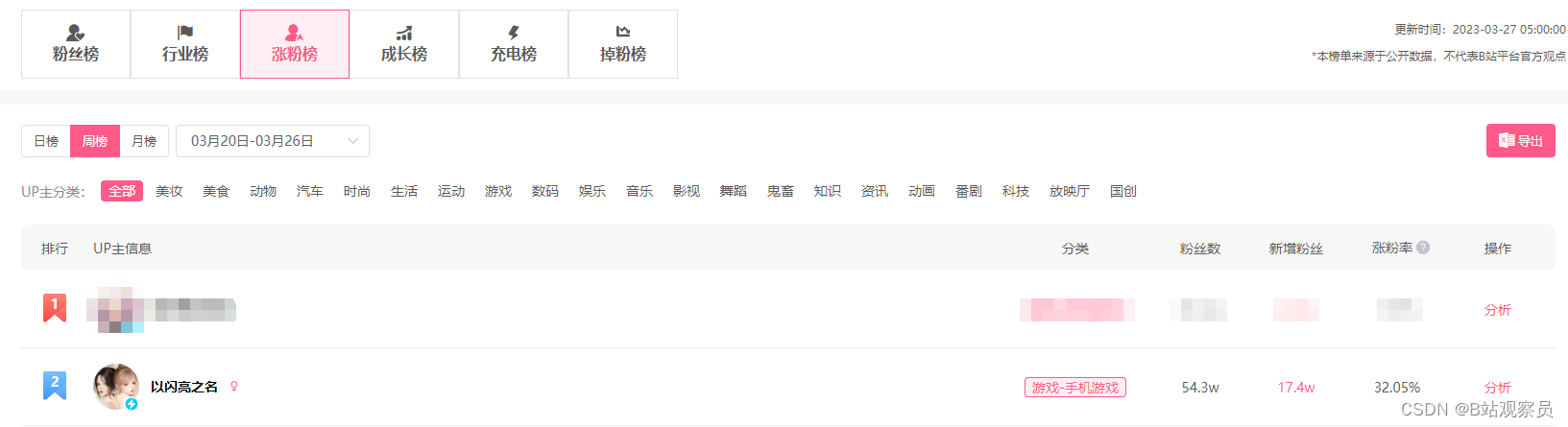其他平台不谈,在飞瓜数据(B站版)榜单显示,以闪亮之名的官方账号在B站一周内就涨粉17.4万,涨粉率高达32.05%,位居榜单第二。