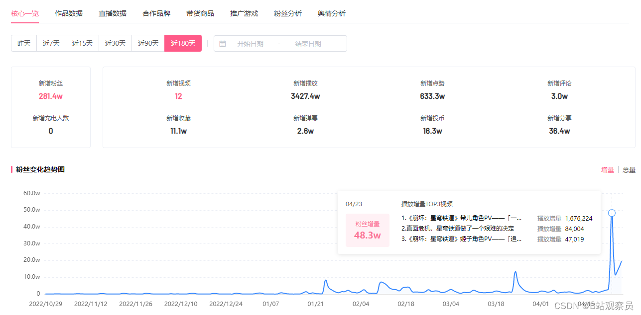 除此之外,《崩坏:星穹铁道》官方号涨粉不断,即便之前游戏还未上线,但是截至目前官方号已经累积490.5w,飞瓜数据(B站版)显示,近180天内官方号涨粉281.4w,数次蝉联涨粉榜榜首的位置。
