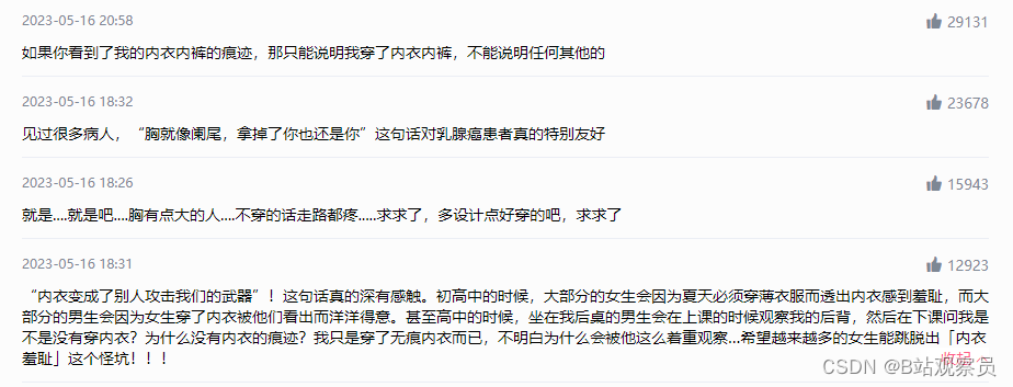 即便这支作品是赞助视频,但是视频的核心仍然是围绕着“她困境”进行创作,依然受到很多女性的支持,在飞瓜数据(B站版)中可以看到,评论区里有很多观众呼吁女性不要有“内衣羞耻”,更有观众提出希望品牌多设计点好穿的内衣产品。