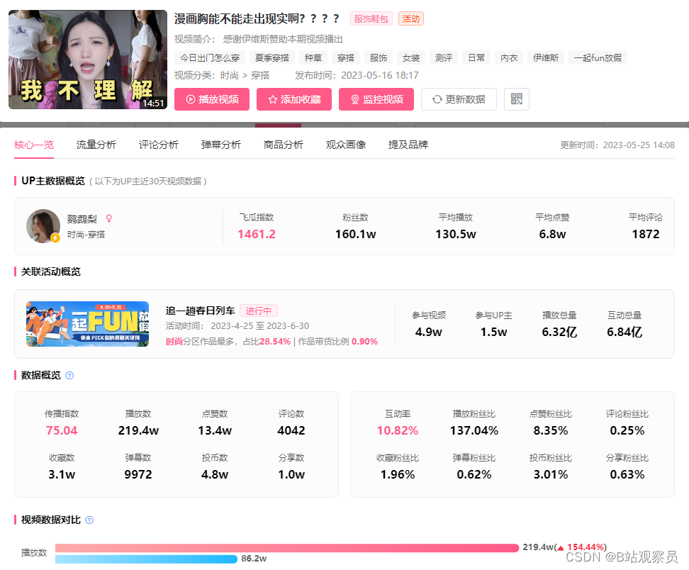 在飞瓜数据(B站版)中可以看到,这支作品刚发布一天就有将近100w的播放,每小时还有超过万数的流量增长。