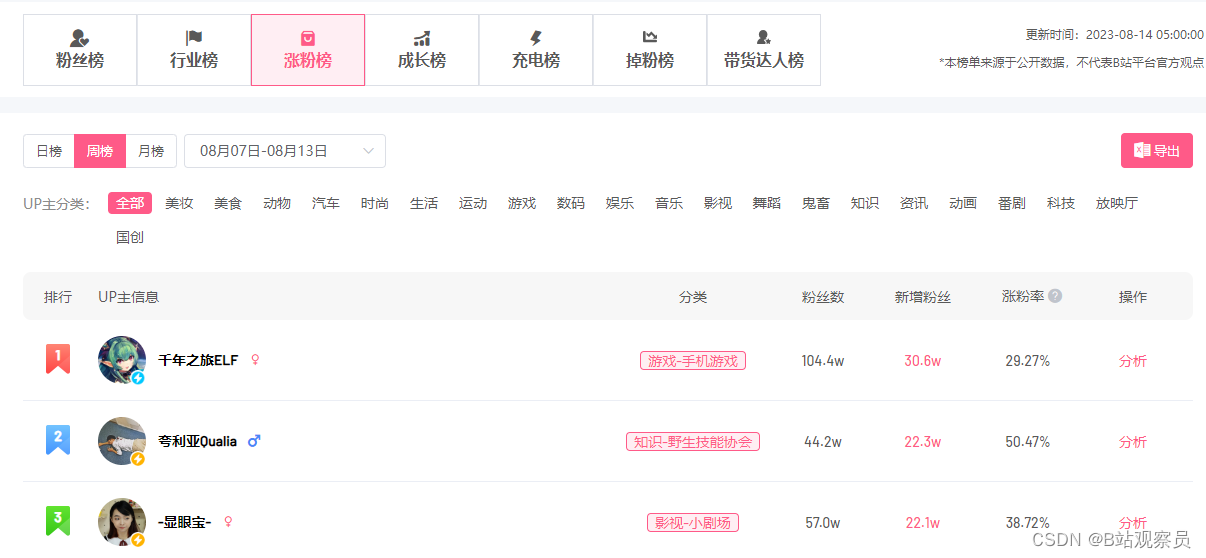 飞瓜数据(B站版)【达人排行榜】-【涨粉榜】显示,继上次的【成长榜】第三之后,UP主-显眼宝-在本周登上了涨粉榜第三的位置,单周涨粉就超过22万。