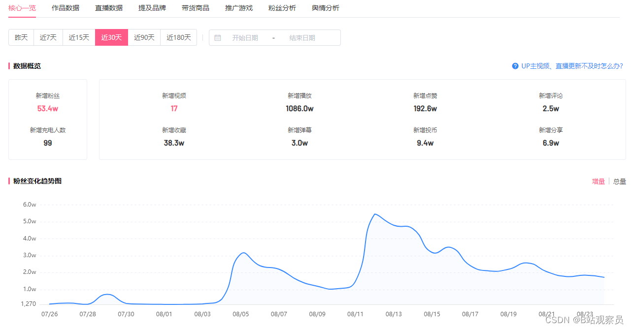 从粉丝变化趋势图可以看到,涨粉高峰期就是在8月。其实UP主并不是什么新人,早在2018年就有在B站更新视频,但是那时候的更新更像是分享日常,并没有系统的内容构建。