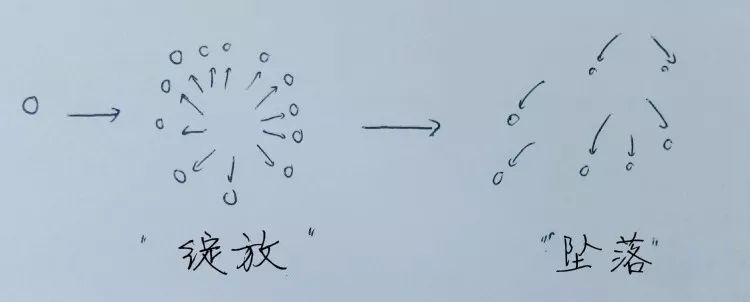如上图示,我们这里通过让画面上一个粒子分裂为X数量的粒子来模拟爆炸效果。粒子会发生“膨胀”,意思是它们会以恒速移动且相互之间的角度相等。这样就能让我们以一个向外膨胀的圆圈形式模拟出烟花绽放的画面。经过一定时间后,粒子会进入“自由落体”阶段,也就是由于重力因素它们开始坠落到地面,仿若绽放后熄灭的烟花。
