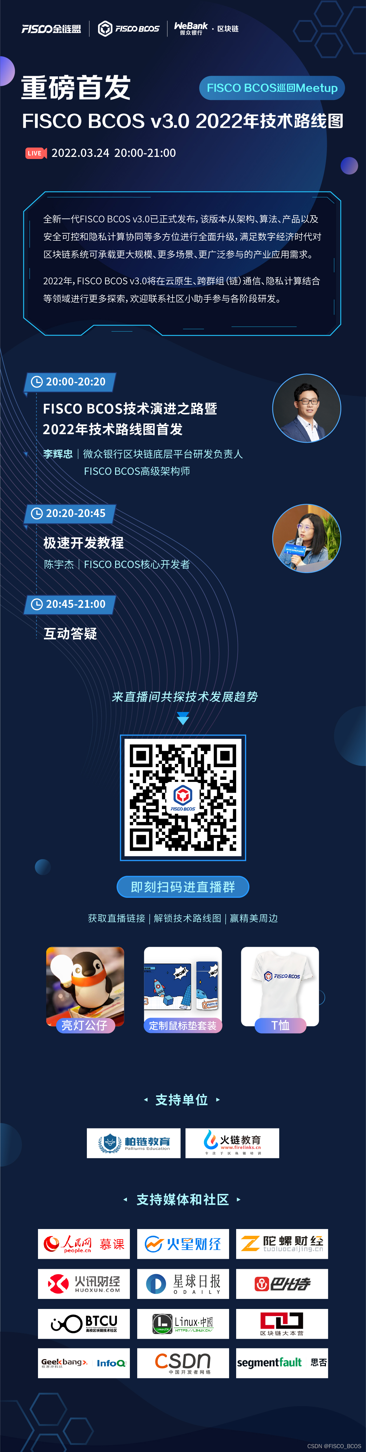 本期Meetup,我们邀请微众银行区块链底层平台研发负责人、FISCO BCOS高级架构师李辉忠,FISCO BCOS核心开发者陈宇杰与大家相聚线上,共探FISCO BCOS v3.0 2022年技术发展路线,并演示如何快速使用FISCO BCOS v3.0,解答大家关心的各种疑问。Meetup将于3月24日(本周四)20:00线上举行,大家可扫描下方二维码进入直播交流群,获取直播链接。