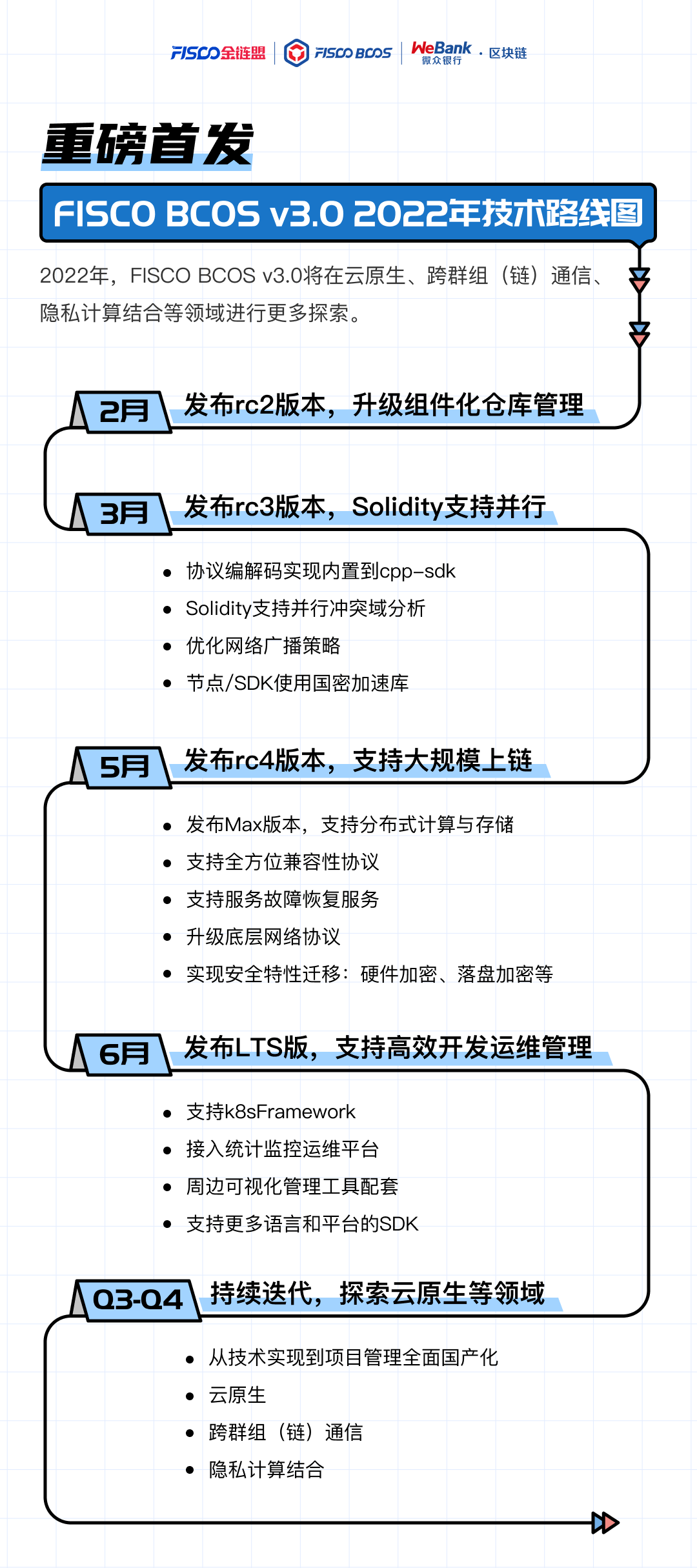 3月24日,FISCO BCOS开源社区举办了《FISCO BCOS v3.0 2022年技术路线图重磅首发》线上Meetup。本次活动中,微众银行区块链底层平台研发负责人、FISCO BCOS高级架构师李辉忠发布FISCO BCOS v3.0 2022年技术发展路线图,并进行详细阐述。