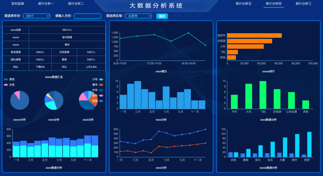 主要图表:柱状图、饼图、地图等。