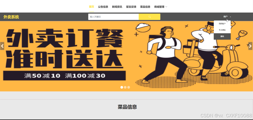 首页:注册用户登录后首先进入前台首页界面,提供系统搜索功能、功能导航栏及菜单信息概览、最新资讯,包括轮播图等。