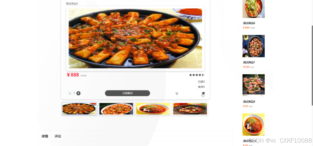 菜品信息:注册用户可查看发布的所有在线菜品信息,提供搜索功能,可根据菜品分类进行筛选,支持热门商品推荐,可进入详情页浏览,并进行收藏、评论(购买后可评论),同时提供立即购买、加入购物车等操作。