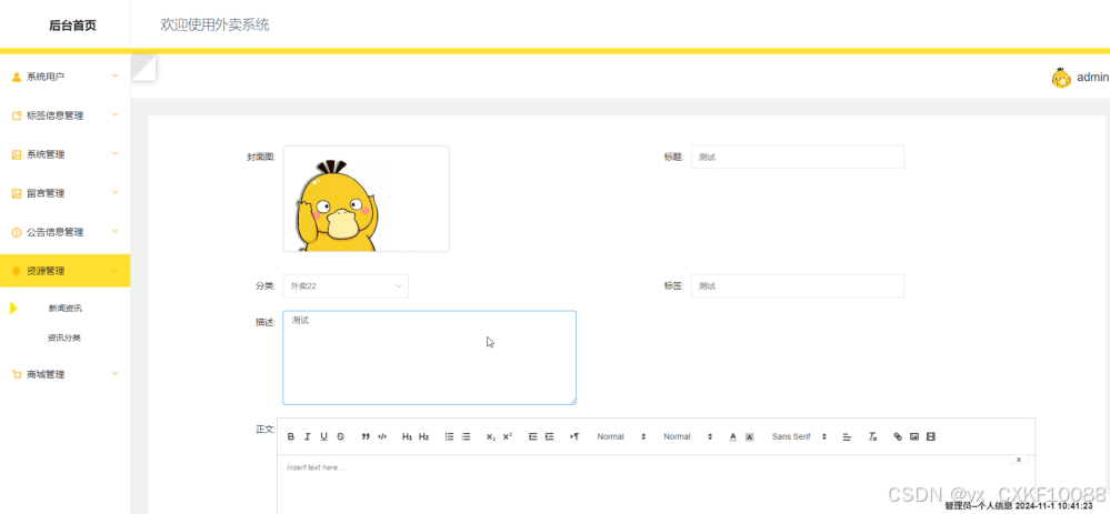 在现代社会中,外卖服务已成为人们日常生活中不可或缺的一部分。在本研究中,我成功构建了一个用户友好、功能全面、操作简单的外送系统,本系统采用前后端分离和模块化设计方式,实现了多元完善的功能如注册、登录、后台首页(数据统计)、系统用户、系统管理、公告信息管理、资源管理、商城管理等功能模块,实现管理和服务全流程,能够很好地满足多用户的不同需求。