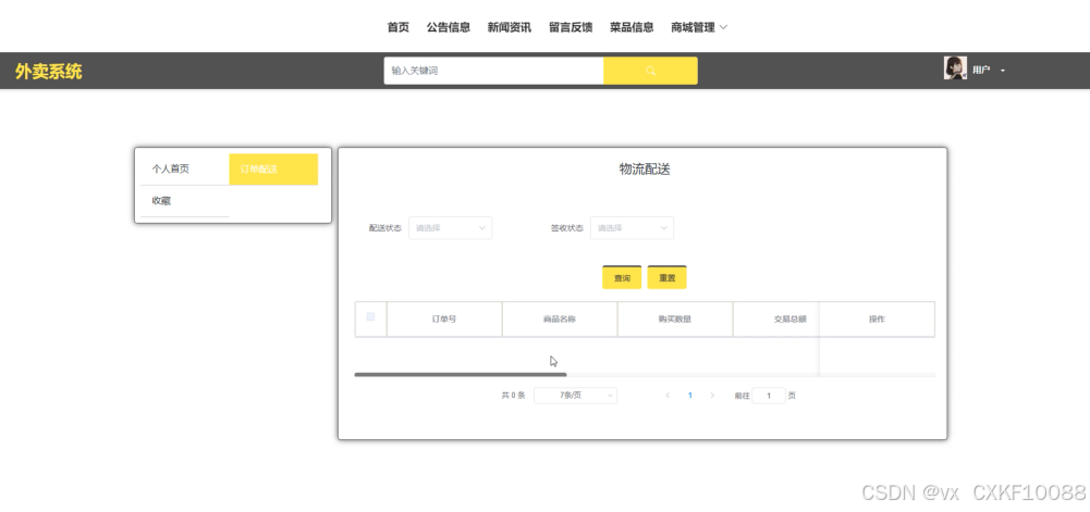 个人中心:注册用户可对个人首页、配送信息、订单配送、收藏管理等信息进行管控。例如,可搜索和查看配送信息(订单开始配送后才有显示);查看和删除收藏的系统信息;管理已发布的评论信息及其回复内容。