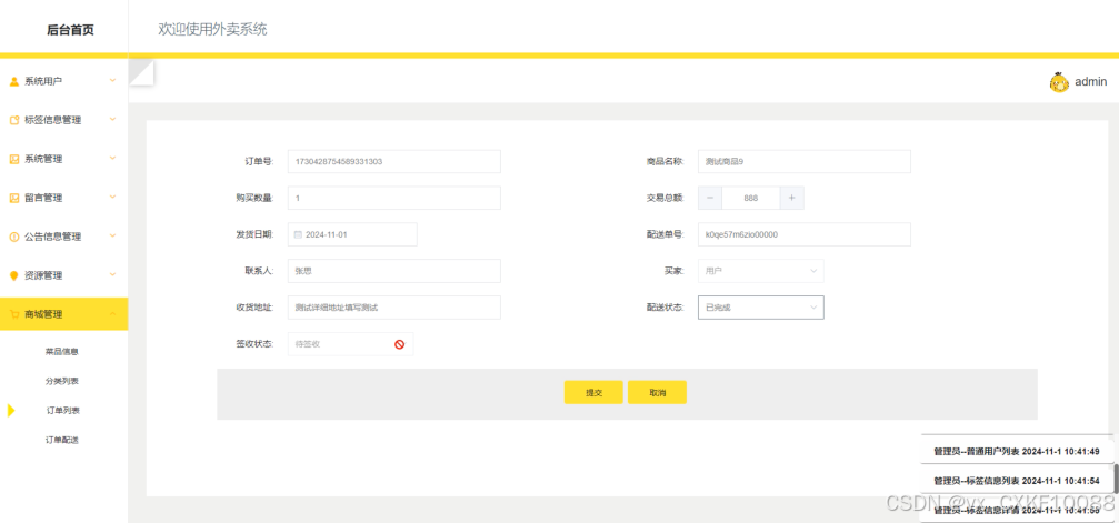 管理员可管理自己的商城信息,包括对菜品信息、分类列表、订单信息、订单配送等信息进行管控。可编辑、发布、删除菜品信息;并且对菜品信息进行分类;处理订单信息,确认和更新订单支付状态,进行配送;更新和跟踪订单配送及签收情况。界面如下图所示。
