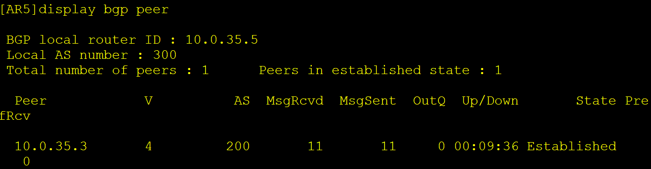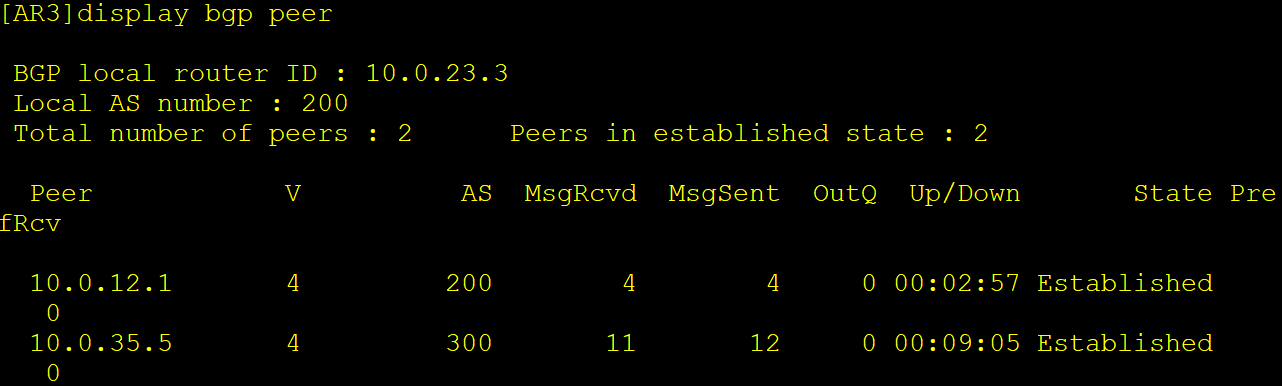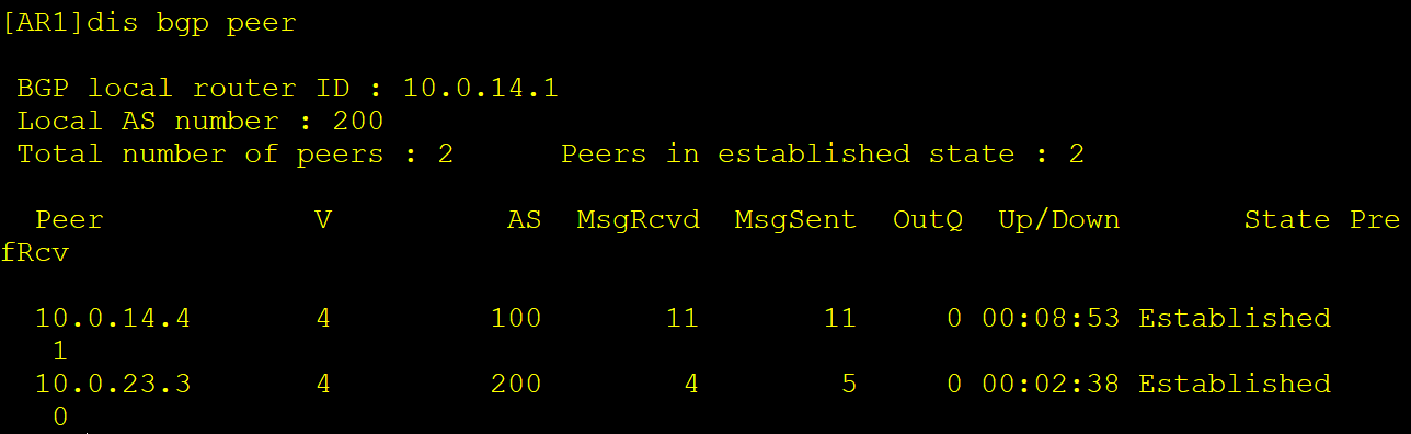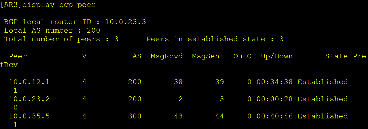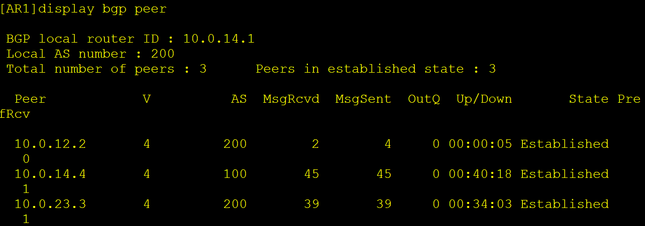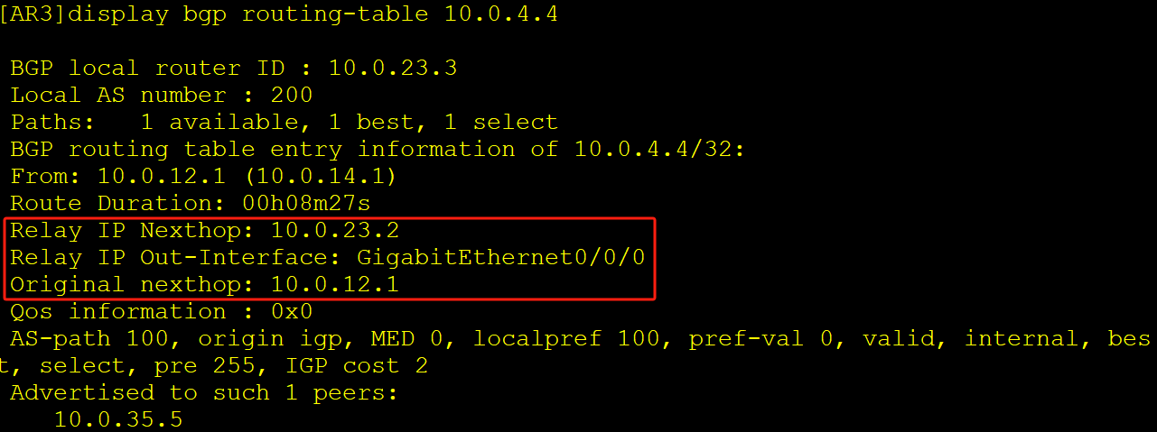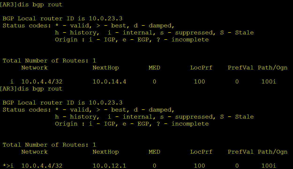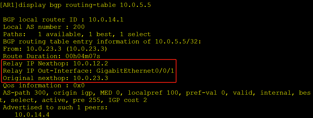 我们可以看到NextHop从10.0.14.4更改为了10.0.12.1并且这条路由变成了有效且最优的路由,那么AR3就会继续往下进行传递这条路由条目。AR5就可以学习到这条路由