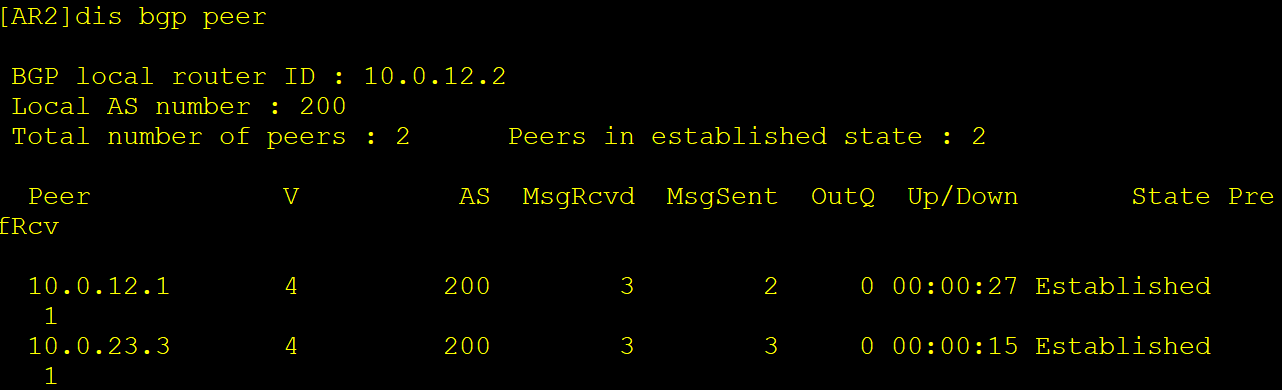 现在我们还没有学习到RR以及联盟,所以现在想要解决这个问题只能使用全互联的方式来实现,让AR1与AR3都与AR2建立BGP邻居关系否则数据无法正常传递。