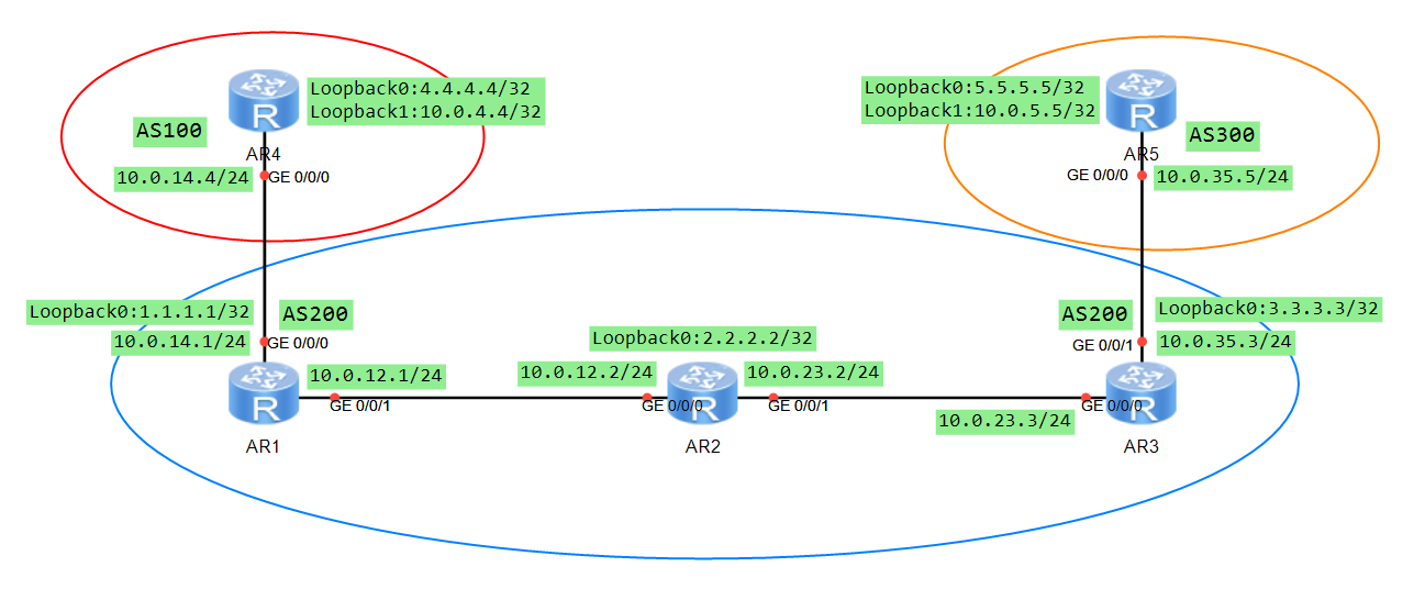 在这张拓扑当中有三个AS,各个AS之间使用静态路由来实现互通,AS内部使用OSPF协议来实现内部网络互通,AS200当中只有AR1与AR3使能BGP协议通过多跳来建立IBGP邻居关系,AS100与AS300都与AS200建立EBGP邻居关系,AR4与AR5分别通告彼此Loopback1的接口IP看看是否可以互相访问。