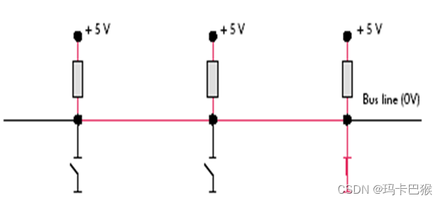 当用2个以上的控制器连接在Canbus总线上(如图所示),用逻辑1来表示断开和用逻辑0表示闭合。不考虑其他总线规则情况下,总线会出现下图的情况: