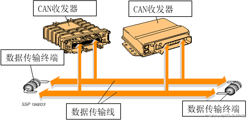 - CAN收发器: 安装在控制器内部,同时兼具接受和发送的功能,将控制器传来的数据化为电信号并将其送入数据传输线。