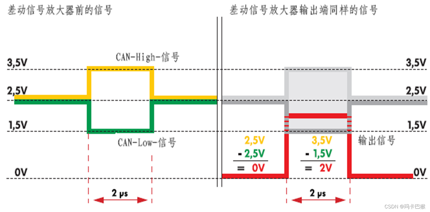 由于CAN-High线和CAN-Low线是扭绞在一起的(双绞线),所以干扰脉冲X就总是有规律地作用在两条线上。由于差动信号放大器总是用CAN-High线上的电压(3.5V-X)减去CAN-Low线上的电压(1.5V-X),因此在经过处理后,差动信号中就不再有干扰脉冲了。