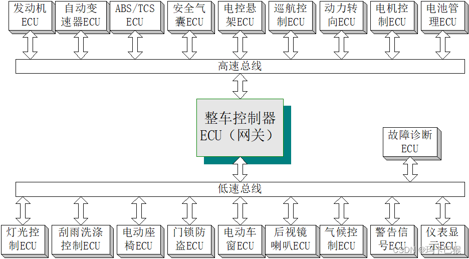 另一条用于车身系统的低速CAN(CAN舒适总线),速率是100kb/s。主要是针对车身控制的,如车灯、车门、车窗等信号的采集以及反馈。其特征是信号多但实时性要求低,因此实现成本要求低。
