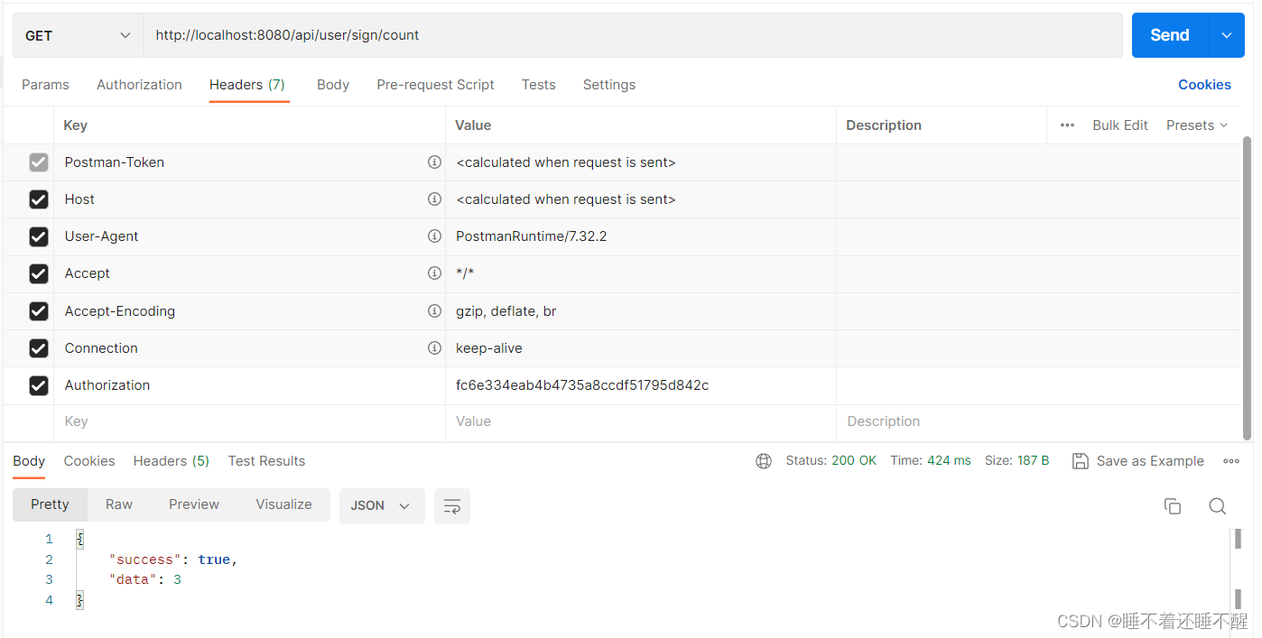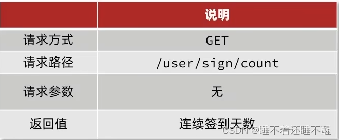 需求:实现下面接口,统计当前用户截止当前时间在本月的连续签到天数