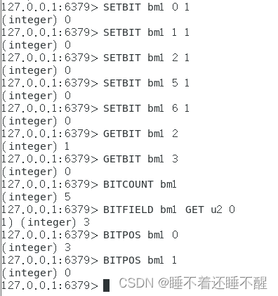 BITFIELD bm1 GET u2 0含义:读取bm1,以无符号十进制的方式读取两位(u2),从第一位开始读取。返回值3代表读取的比特位是11