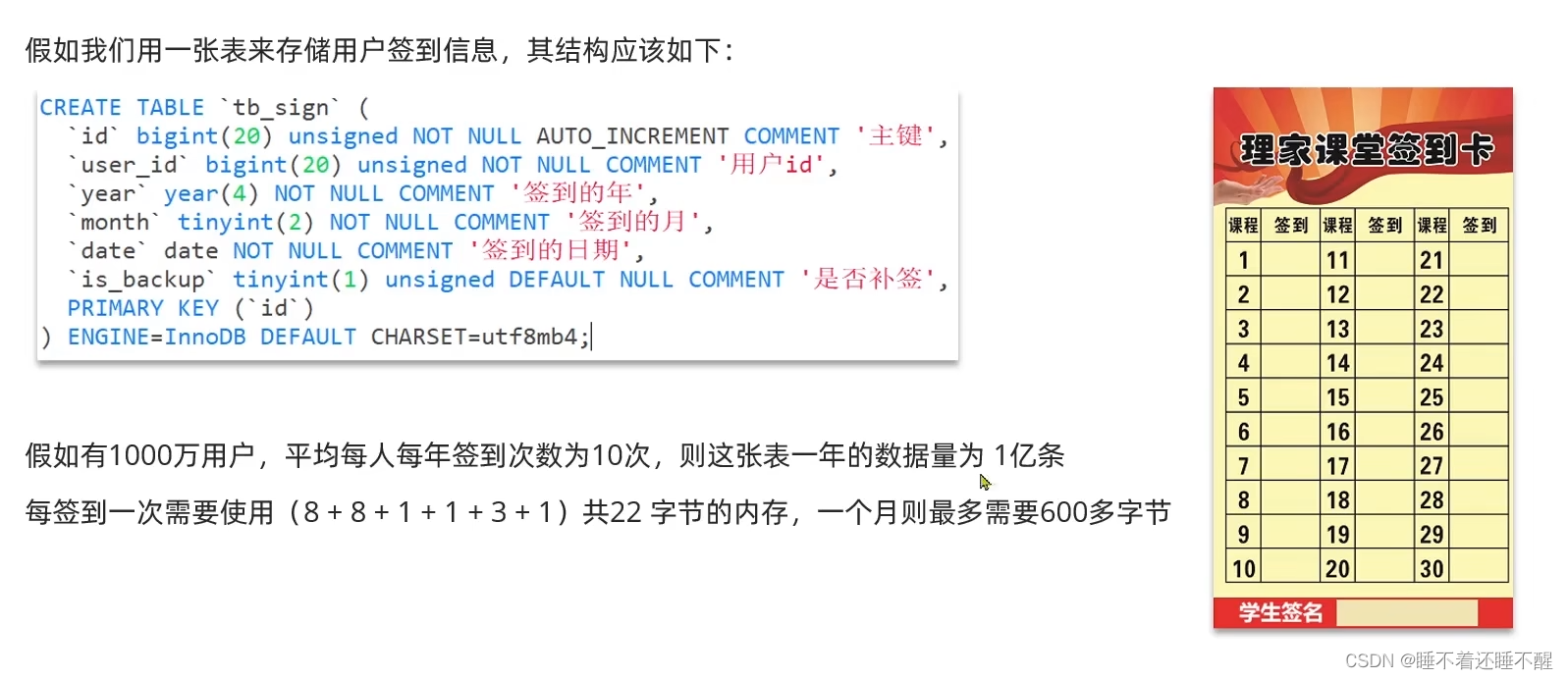 我们按月来统计用户签到信息,签到记录为1,未签到则记录为0