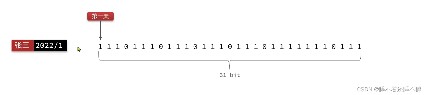 把每一个bit位对应当月的每一天,形成了映射关系。用0和1标示业务状态,这种思路就称为位图(BitMap)