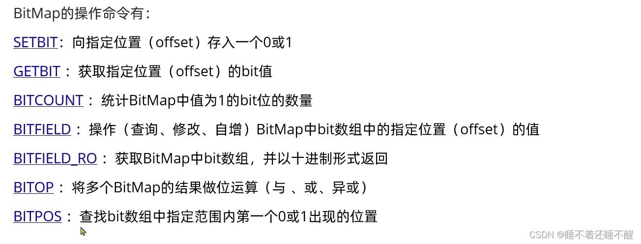 提示:因为BitMap底层是基于String数据结构,因此其操作也都封装在字符串相关操作中了。(Redis的字符串)